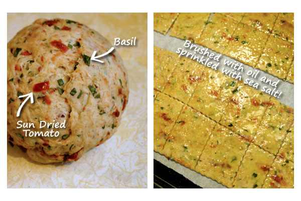 Tip: Avoid baking these crackers too long because excess browning will diminish the basil flavour in the crackers.