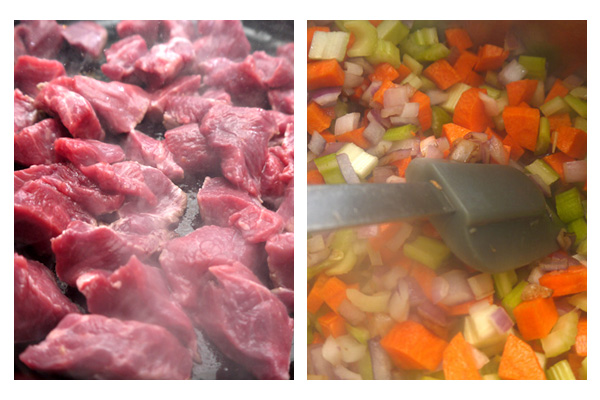- Heat oil in a large heavy pot or dutch oven on high heat. Sautee stewing beef until browned on all sides - this will give the soup more flavour.