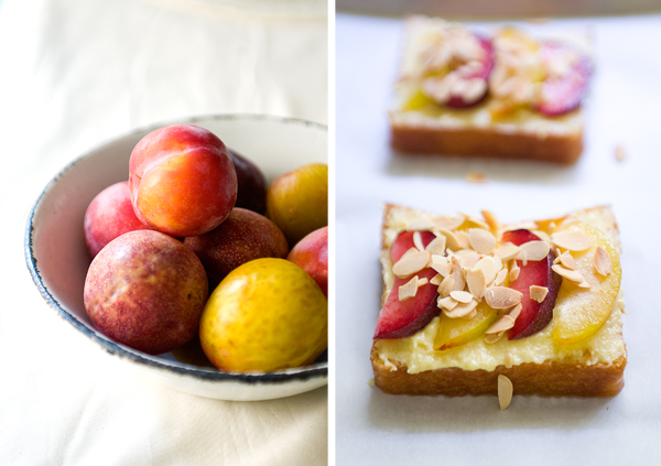 - Spread a thin layer, about 2 tablespoons of almond cream onto the soaked brioche. Arrange 4 slices of plumcots on top, sprinkle top with about a tablespoon of sliced almonds. Finish the rest of the brioche slices.