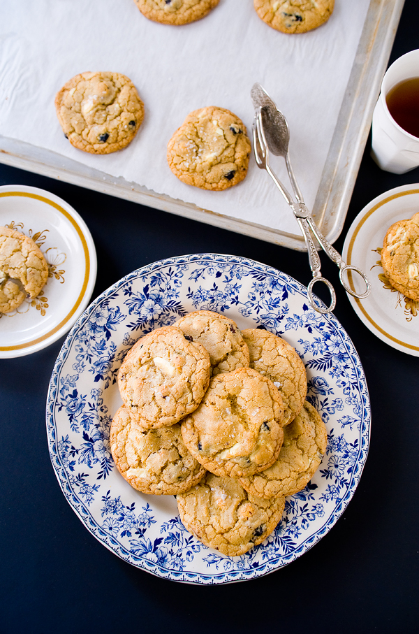 I think the first time I baked a chocolate chip cookie was when I was in elementary school. I probably baked the recipe behind the Hershey’s Chipits package. I thought it tasted amazing the first time I had it fresh. But I always wondered how they make cookies chewy, you know, the big mass-produced ones sometimes found in vending machines. I finally came to understand through reading cookbooks, that the recipe makes all the difference, such as the brown sugar proportion, butter, etc. Taking a break from some of the more complex recipes that I recently posted, I am sharing this simple cookie recipe with my own little twist. Instead of the good old chocolate chip, I added what I think are absolutely delicious – toasted hazelnuts, white chocolate, and dried blueberries. Chewy, salty, nutty, fruity and chocolaty, these salty white chocolate hazelnut blueberry cookies are the perfect companion with a good cup of black coffee.